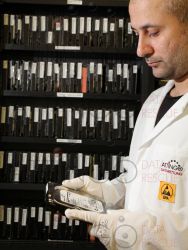 Im Reinraumlabor wird die Magnetoberfläche auf sichtbare Schäden untersucht